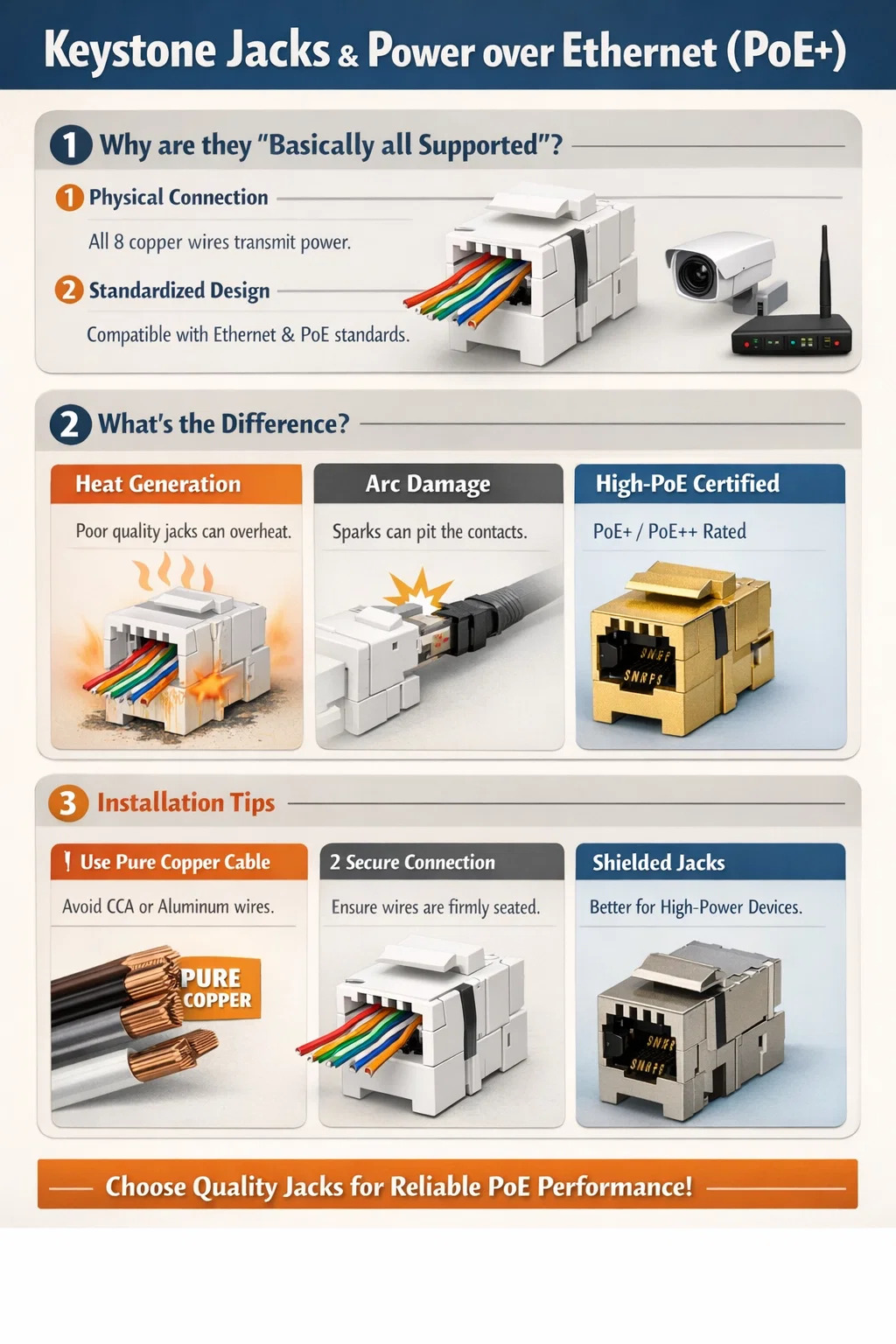 ตัวเชื่อมต่อสายเคเบิลเครือข่ายมาตรฐานส่วนใหญ่ ( คีย์สโตน แจ็คส์ ) รองรับ Power over Ethernet (PoE) ทางกายภาพ แต่ไม่ใช่ว่าผลิตภัณฑ์ทั้งหมดจะเชื่อถือได้เท่ากันภายใต้การทำงานที่มีโหลดสูงจริง